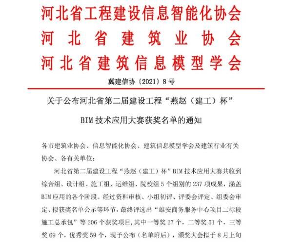 7月14日,河北省第二屆建設工程“燕趙(建工)杯”BIM技術(shù)應用大賽獲獎名單揭曉,公司參賽的7項成果全部獲獎,其中一等獎2項、二等獎2項、三等獎3項。