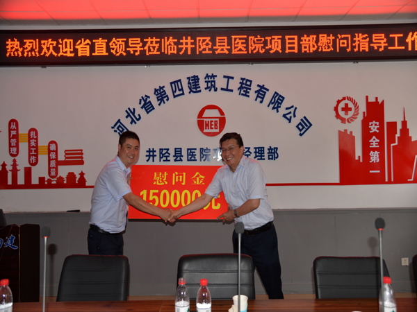 7月26日下午,河北省直工委副書(shū)記范金龍一行到二分公司井陘縣醫院項目部,對奮戰在一線(xiàn)的職工進(jìn)行暑期慰問(wèn),為他們送來(lái)了慰問(wèn)金和慰問(wèn)品。集團工會(huì )主席王文利、公司黨委副書(shū)記、紀委書(shū)記、工會(huì )主席李懷生、二分公司黨總支書(shū)記孫立鋒一同參加。