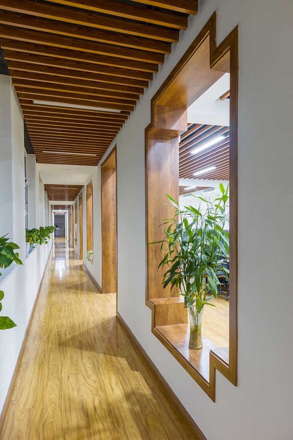 由于辦公區裸露門(mén)洞窗洞較多,極具藝術(shù)感,于是在設計風(fēng)格方面設計師借鑒了中式古典花窗元素,將四個(gè)窗洞設計為不同造型,曲直轉折均一絲不茍,淋漓盡致地展現出中式古典花窗的特點(diǎn),使得簡(jiǎn)潔的空間多了一絲東方韻味。這樣舒適雅致的辦公環(huán)境更能激發(fā)設計師的創(chuàng )作靈感,讓設計師創(chuàng )作出更好的設計作品。