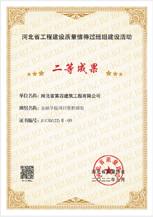 9月16日,六分公司收到了河北省質(zhì)量協(xié)會(huì )頒發(fā)的證書(shū),河北金融學(xué)院項目管控班組榮獲“河北省工程建設質(zhì)量信得過(guò)班組建設活動(dòng)”二等成果,并被推薦到中國建筑業(yè)協(xié)會(huì )交流。