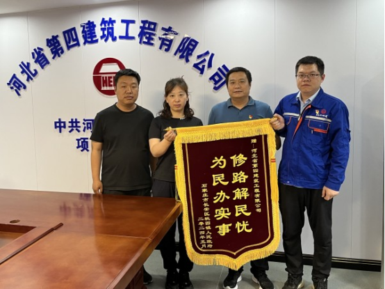“感謝河北四建對鎮政府工作的大力支持,解決了桃園鎮學(xué)府聯(lián)合社區前進(jìn)村與滹沱河河堤路之間的道路損壞嚴重的大問(wèn)題……”6月5日下午,石家莊市長(cháng)安區桃園鎮人民政府代表琚紅珊帶著(zhù)濃濃的謝意專(zhuān)程來(lái)到九分公司中共河北省委黨校項目部,將“為民辦實(shí)事 修路解民憂(yōu)”的錦旗交到分公司黨總支書(shū)記、經(jīng)理劉喜良手里,對河北四建公司的大力支持和幫助表示誠摯感謝。