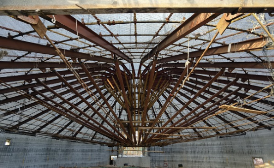 體系設計優(yōu)化,拼裝提速?!颁摻罨炷镣矀}錐殼頂板架空支撐施工工法”依托糧食類(lèi)筒倉工程,筒倉建筑高度高達50米,內徑26米,倉頂設計為錐殼頂、平頂雙層結構,斜錐殼板厚0.2米。以往筒倉倉壁一般采用滑模施工,錐殼頂板施工復雜,一般采用H型鋼組裝成圓柱形核心筒、外輻射鋼桁架平梁的方式組裝成支撐平臺,重21.9噸,用鋼量大,制作成本高;節點(diǎn)連接采用焊接,拼裝速度慢,無(wú)法滿(mǎn)足群體筒倉的周轉時(shí)效。分公司針對傳統做法的弊端,組織科研小組,專(zhuān)項研究,破解難題,最終形成了空間鋼桁架——拉索組合結構支撐體系。該體系摒棄了3.2米直徑的圓柱型核心筒,采用直徑2.6米的傘狀中心筒,通過(guò)五道環(huán)梁環(huán)向拉接,無(wú)需設置斜撐,原結構減輕將近1噸,節約了制作成本,而且承壓能力更強。重點(diǎn)節點(diǎn)還改用了高強螺栓連接代替焊接,拼裝速度明顯提升,施工速度更快。