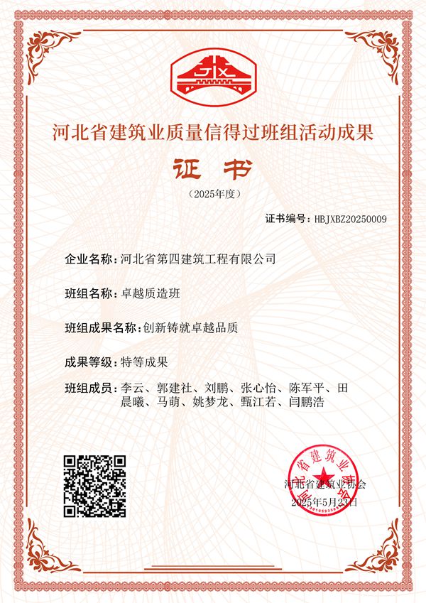 5月25日,三分公司收到河北省建筑業(yè)協(xié)會(huì )關(guān)于2025年度河北省建筑業(yè)質(zhì)量信得過(guò)班組活動(dòng)結果的通報,由分公司“卓越質(zhì)造班”班組完成的“創(chuàng )新鑄就卓越品質(zhì)”成果,被評為“特等成果”。