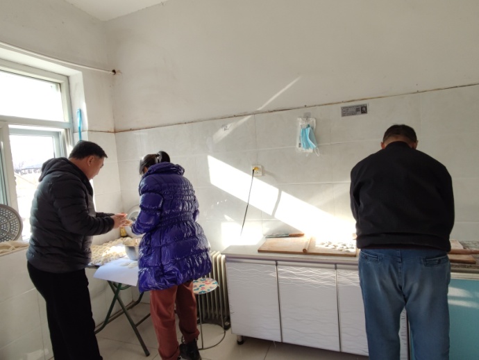 上午十一點(diǎn)半,王建忠親自調餃子餡,依次放鹽、姜末、醬油、料酒、香油,并不斷攪拌,直至肉末和白菜相互融合。分公司職工各自分組,餃子餡分兩份,搟面杖準備兩根。廚房里,搟面杖快速地轉動(dòng)著(zhù),一雙雙手用力地捏著(zhù),大家井然有序,忙得不亦樂(lè )乎。每個(gè)人手藝不同,雖然包的餃子各具形態(tài),搟的面皮兒薄厚、大小不一,但都是職工的心意。在此過(guò)程中,大家互相傳授包餃子、搟皮兒的經(jīng)驗,食堂充滿(mǎn)歡樂(lè )、溫馨的氣氛。