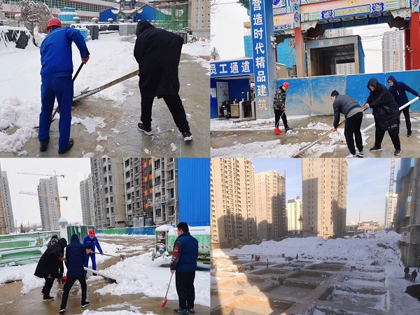 由于本輪低溫降雪持續時(shí)間較長(cháng),整個(gè)施工現場(chǎng)積雪不僅厚還很瓷實(shí),清掃工作十分困難。寒風(fēng)凜冽刺骨,但大家熱情高漲,充分發(fā)揚不怕苦、不怕累的精神,黨員干部帶頭,職工群眾踴躍參加,按照分工好的清掃區域全面鋪開(kāi)進(jìn)行。設備管理員系上安全帶爬上塔吊,清理積雪,先后對各類(lèi)機械設備進(jìn)行維修保養,檢查是否存在安全隱患;電工按照巡檢路線(xiàn)展開(kāi)防寒防凍措施檢查,并對臨電周邊積雪進(jìn)行清理;其他管理人員掃的掃、鏟的鏟、相互配合,清除辦公區及生活區積雪;在施工區域,各分包隊伍清理道路積雪,對1#、2#、6#、10#住宅樓各層采取冬季保暖措施,并對門(mén)窗逐個(gè)進(jìn)行封閉;項目經(jīng)理帶隊,加強現場(chǎng)巡護,落實(shí)落細各項安全措施,確保雪后順利復工。經(jīng)過(guò)大家一個(gè)上午的通力合作,高質(zhì)高效地完成了掃雪除冰工作,確保重點(diǎn)區域沒(méi)有積雪結冰,切實(shí)保障了項目有序運行。