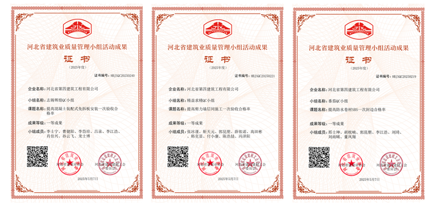 5月15日,七分公司申報的“提高防水卷材SBS一次封邊合格率”“提高剪力墻層間施工一次驗收合格率”“提高混凝土裝配式免拆板安裝一次驗收合格率”三項QC成果,被河北省建筑業(yè)協(xié)會(huì )評為“一等成果”。這不僅是河北省建筑業(yè)協(xié)會(huì )對分公司技術(shù)創(chuàng )新能力的高度認可,更是分公司扎實(shí)開(kāi)展QC小組活動(dòng)、有效攻克施工難題、提升項目施工質(zhì)量的生動(dòng)寫(xiě)照。