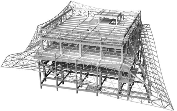 該工程表皮結構采用圓鋼管相貫焊接的單層鋼網(wǎng)格結構,局部采用平面鋼桁架,表皮鋁板采用白色穿孔鋁板,雙曲穿孔鋁板外圈穿孔位置距邊線(xiàn)20mm,其余穿孔位置為不規則孔。面對外裝飾層鋼結構造型復雜、精度要求高等挑戰,項目部依托BIM技術(shù)構建數字化解決方案,通過(guò)Tekla軟件精確計算桿件內力和優(yōu)化拼裝單元,將傳統的二維圖紙轉化為三維可視化模型,便于更直觀(guān)地理解復雜節點(diǎn)和施工流程。利用Navisworks和BIMFILM軟件進(jìn)行施工動(dòng)畫(huà)模擬,通過(guò)三維可視化模型編排制作吊裝順序,形成吊裝三維演示動(dòng)畫(huà),優(yōu)化施工順序和工序銜接,確保施工安全、質(zhì)量,有效提高施工效率。引入智能測量技術(shù),以全站儀、電子水準儀等設備實(shí)時(shí)監控安裝精度,形成“模擬預判+動(dòng)態(tài)糾偏”的質(zhì)量保障體系。在鋼網(wǎng)架安裝前,將全站儀、電子水準儀、GPS定位系統采集的數據進(jìn)行綜合對比分析,提高測量放線(xiàn)精度,通過(guò)實(shí)時(shí)數據監控及時(shí)調整施工過(guò)程中的誤差,實(shí)現動(dòng)態(tài)糾偏。鋼網(wǎng)架拼裝單元安裝完成后,通過(guò)實(shí)際測量采集數據與模型進(jìn)行對比,修正調整施工誤差。此外,項目部通過(guò)無(wú)人機掃描技術(shù)對安裝后的鋼結構骨架成品空間坐標進(jìn)行驗收,為后續鋁板表皮安裝提供精準數據,確保建筑外觀(guān)效果與設計一致。